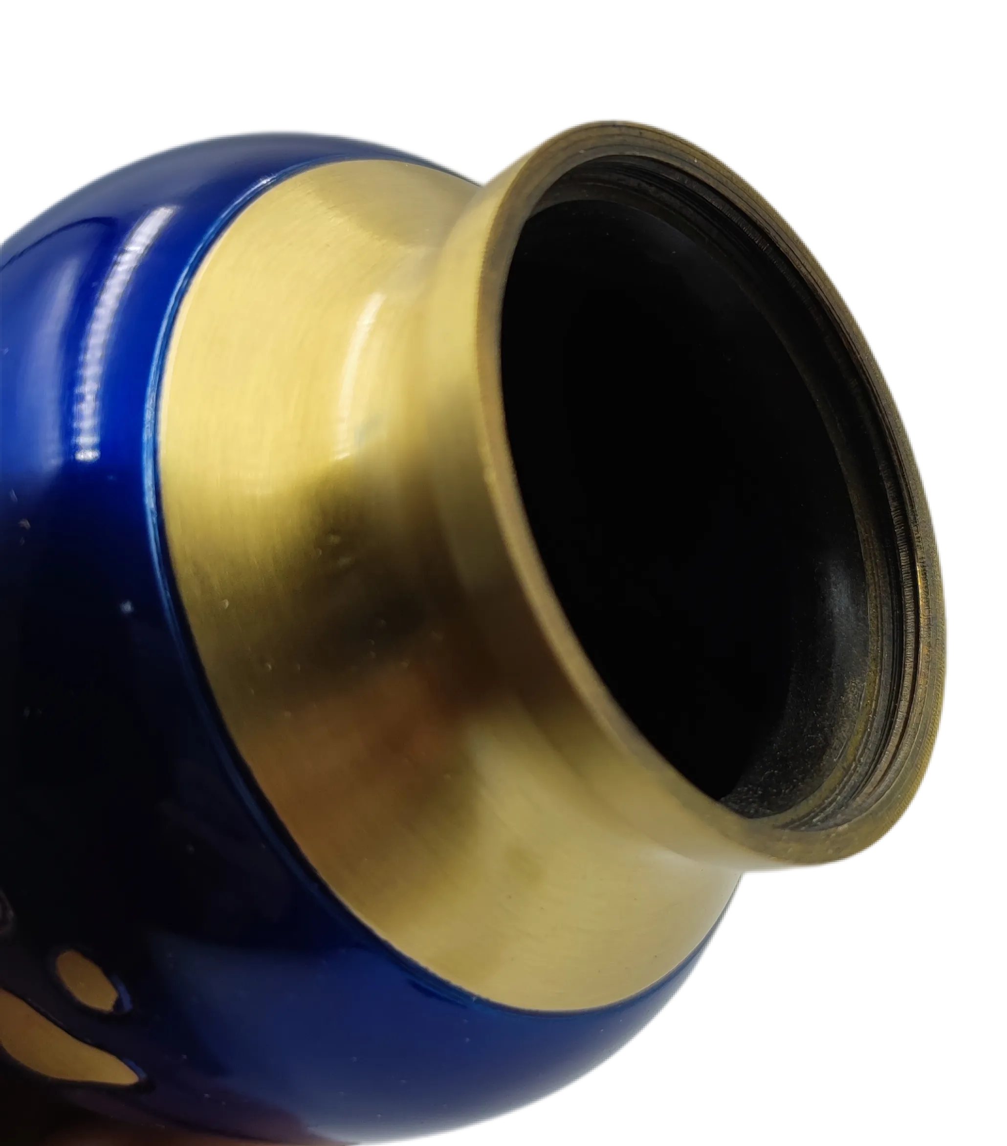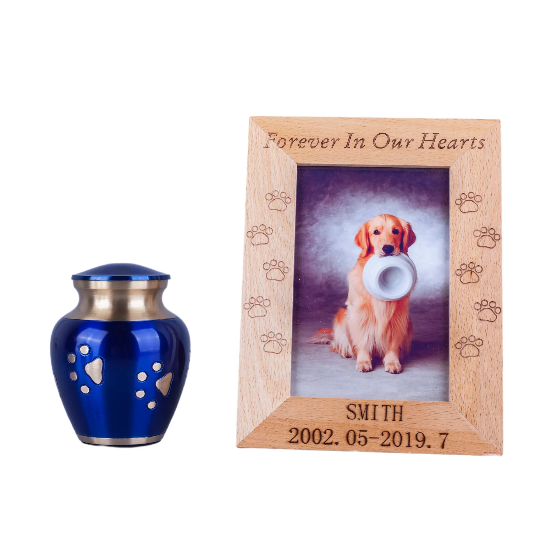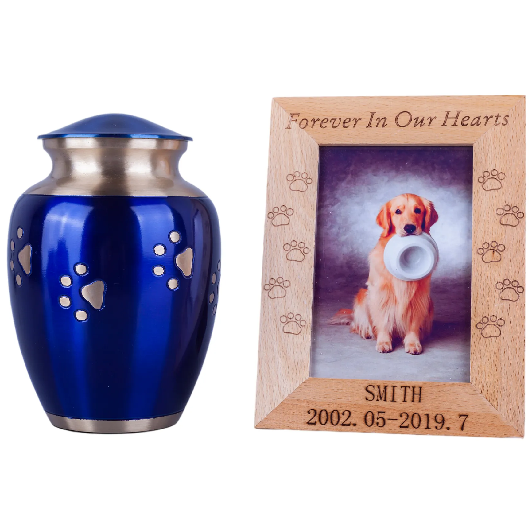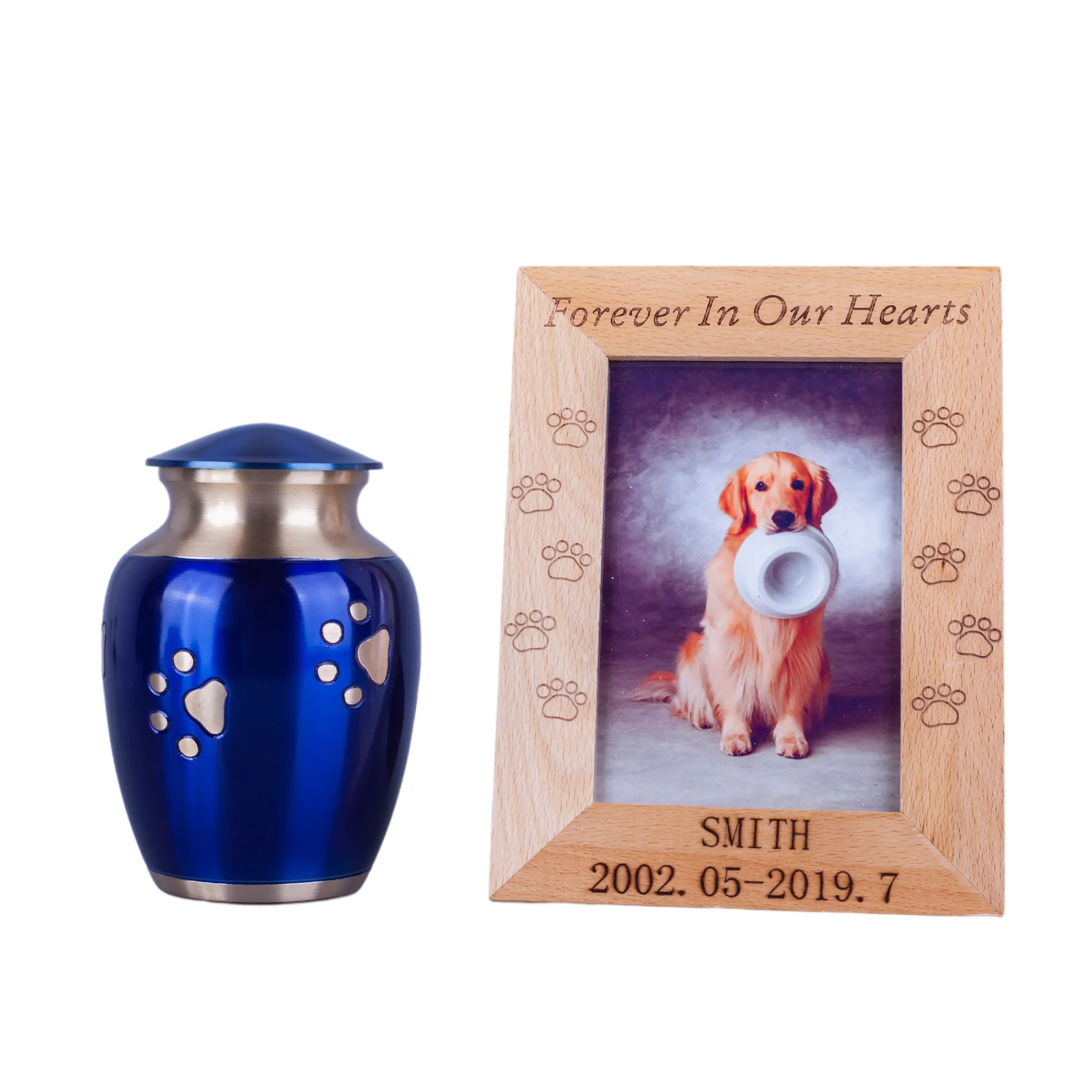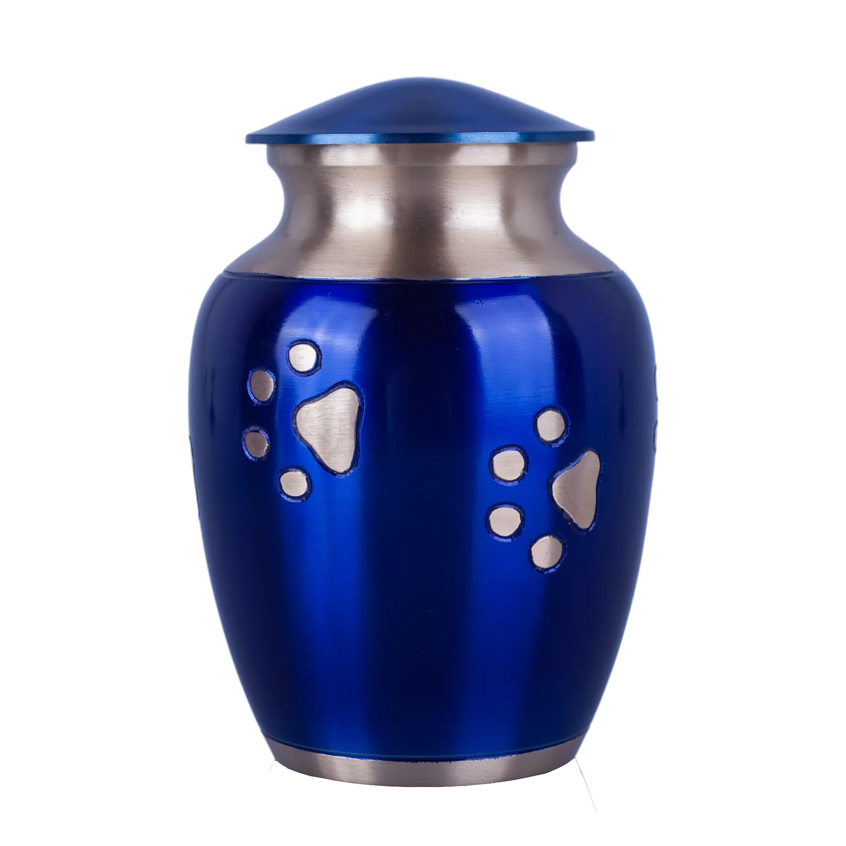 This solid brass urn is finished in a blue color with a hand carved golden paw print design walking up and a felt bottom. The threaded screw-on top safely secures your pet’s ashes. It comes in three sizes – Large, Medium and Small.