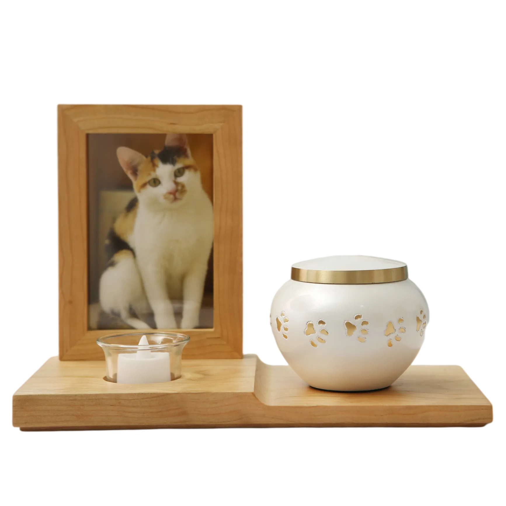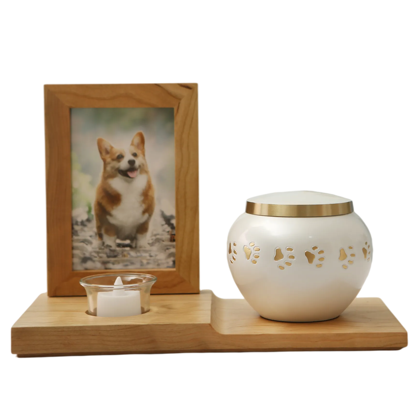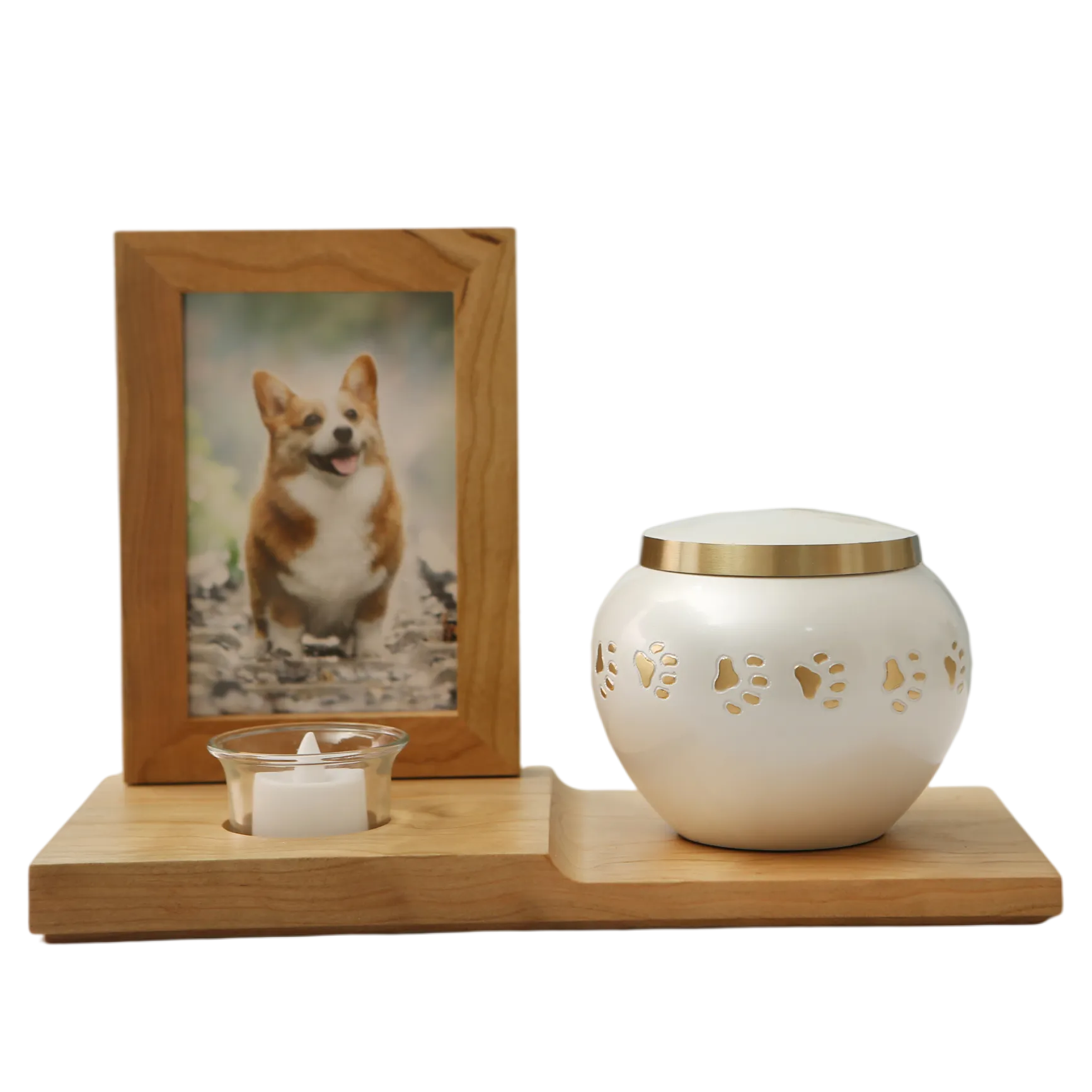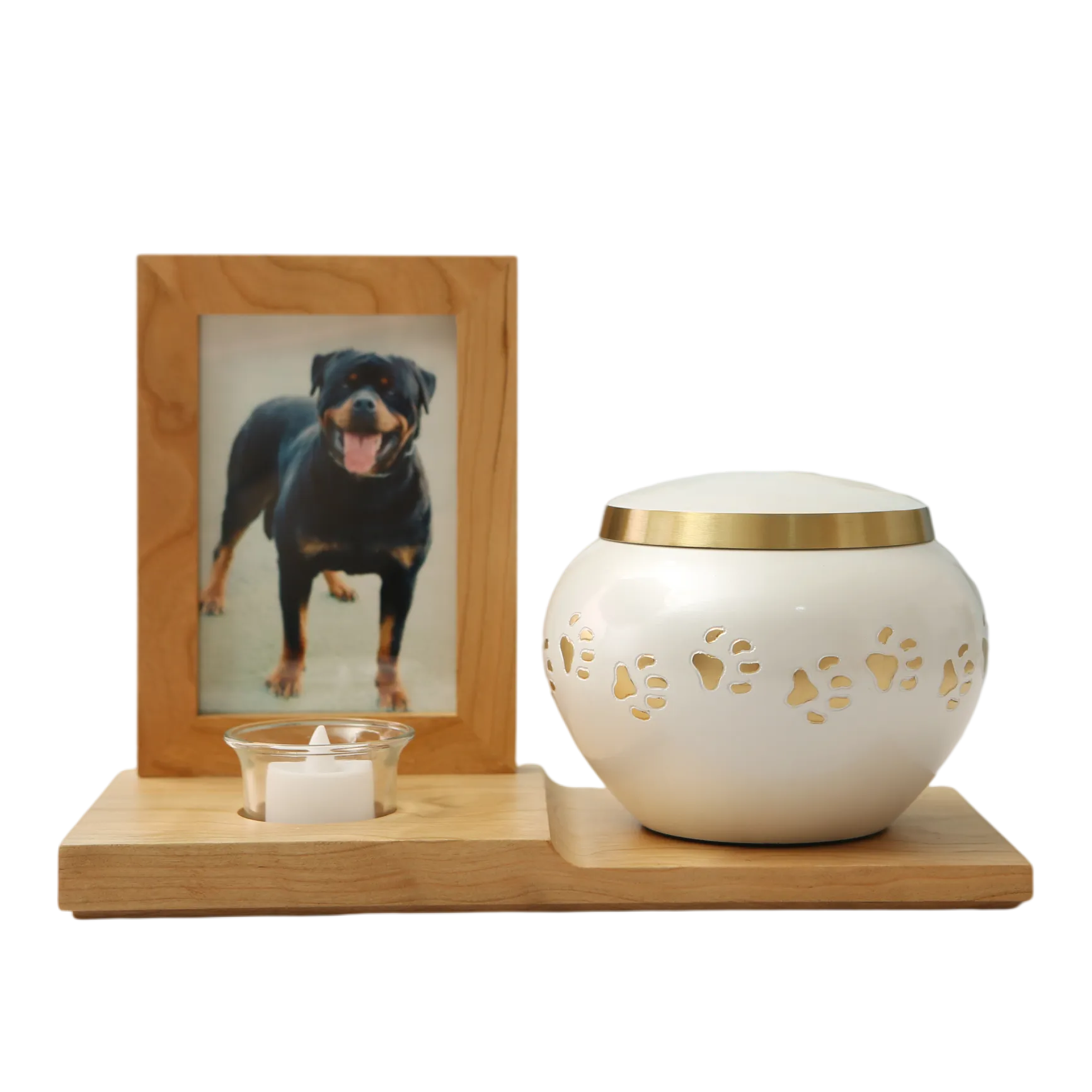 This solid brass urn is finished in a Slate color with a hand carved golden paw print design on top of the lid and a felt bottom. The threaded screw-on top safely secures your pet’s ashes. It comes in three sizes; Large, Medium or Small.